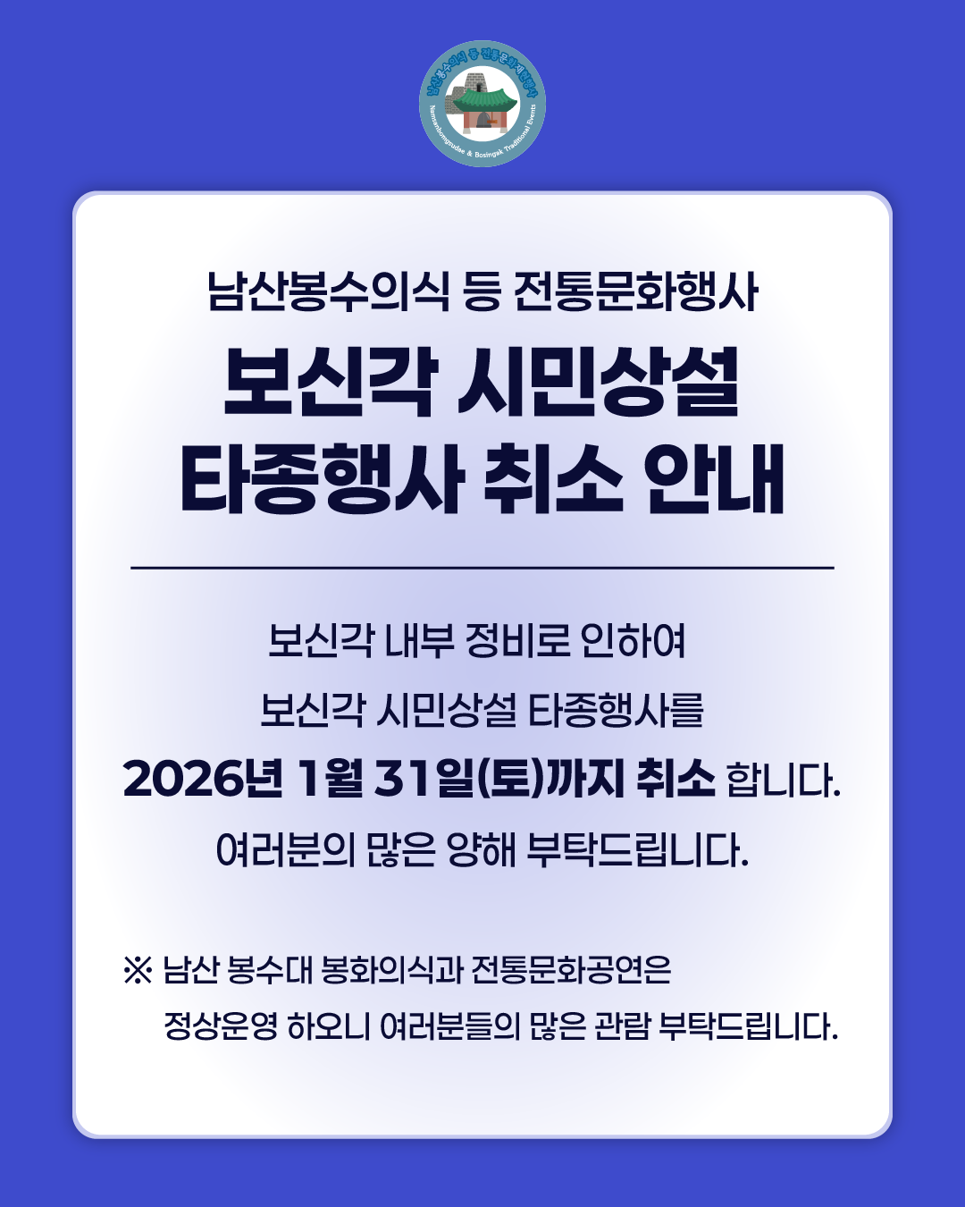 1¿ù º¸½Å°¢ ½Ã¹Î»ó¼³ ŸÁ¾Çà»ç Ãë¼Ò ¾È³»