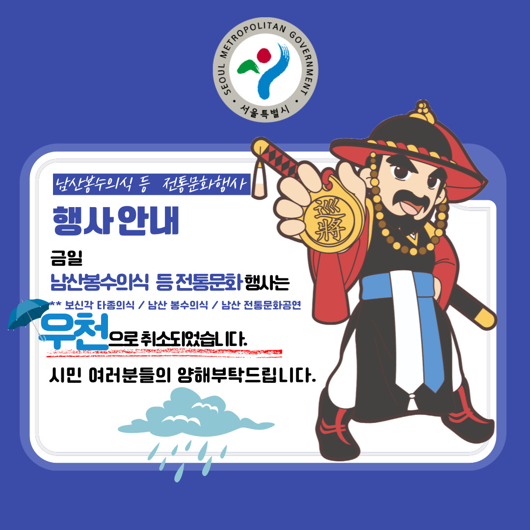 ±ÝÀÏ ³²»ê ÀüÅ빮Ȱø¿¬(»ç¹°³îÀÌ/¹«¿¹24±â)(15:00-15:40) Àº ¿ìõÀ¸·Î ÀÎÇØ Ãë¼Ò µÇ¾ú½À´Ï´Ù.